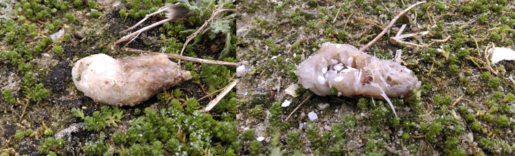 Op de linker foto een dichte braakbal met een beschermend slijmlaagje, in de rechter braakbal zie je de otolieten zitten, de kleine witte schijfjes.