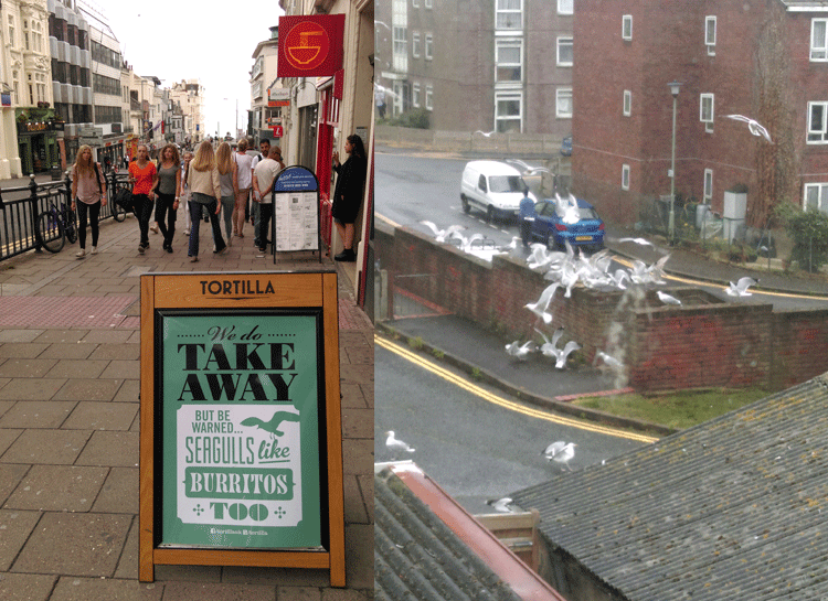 Brighton ligt aan de kust dus we zien ook veel meeuwen in de stad. In de zoetwater fonteinen komen ze drinken en badderen. Op de ene plaats eten ze ongevraagd mee, op de andere plaats krijgen ze de restjes van een vriendelijke bewoner. Het zijn vooral zilvermeeuwen die we zien.